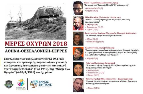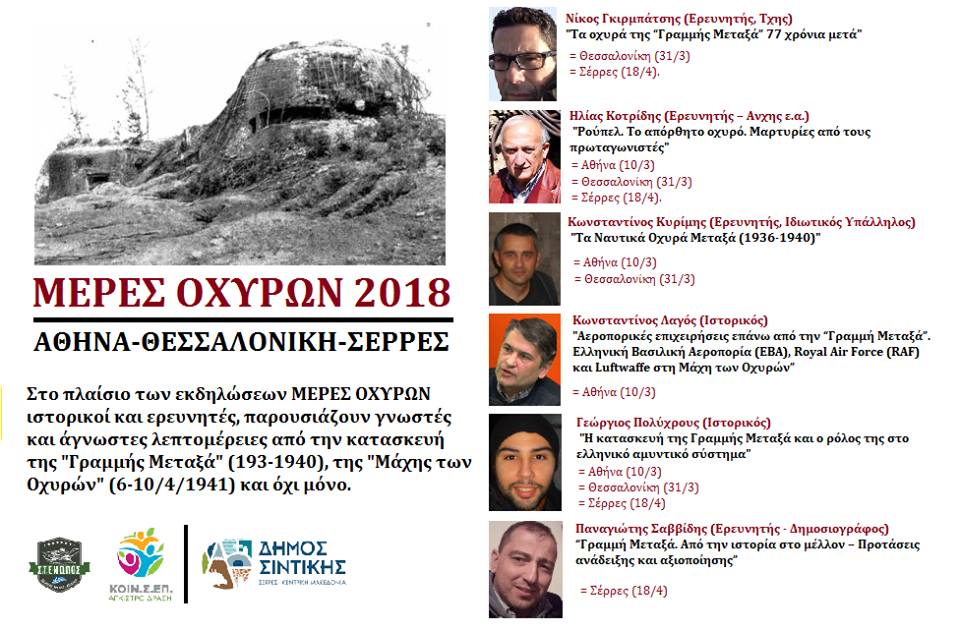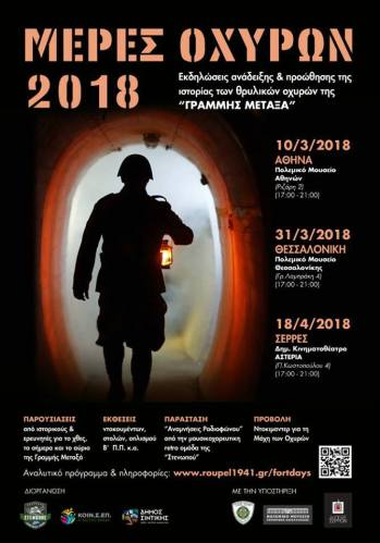 Με στόχο την ανάδειξη της ιστορίας της «Μάχης των Οχυρών» (6-10/4/1941), καθώς και της προώθησης του φεστιβάλ ιστορικής αναβίωσης Β’ Π.Π. (historical reenactment) «ΡΟΥΠΕΛ 1941. Η ΑΝΑΒΙΩΣΗ» που θα διεξαχθεί στις 12 & 13 Μαίου 2018, η Κοιν.Σ.Επ. «Άγκιστρο Δράση» και το σωματείο «ΣΤΕΝΩΠΟΣ – Οχυρώσεις Μπέλλες & Αγκίστρου» διοργανώνουν σε συνεργασία και με την υποστήριξη του Δήμου Σιντικής, τις εκδηλώσεις «ΜΕΡΕΣ ΟΧΥΡΩΝ» στις πόλεις Αθήνα (10/3), Θεσσαλονίκη (31/3) και Σέρρες (18/4).
